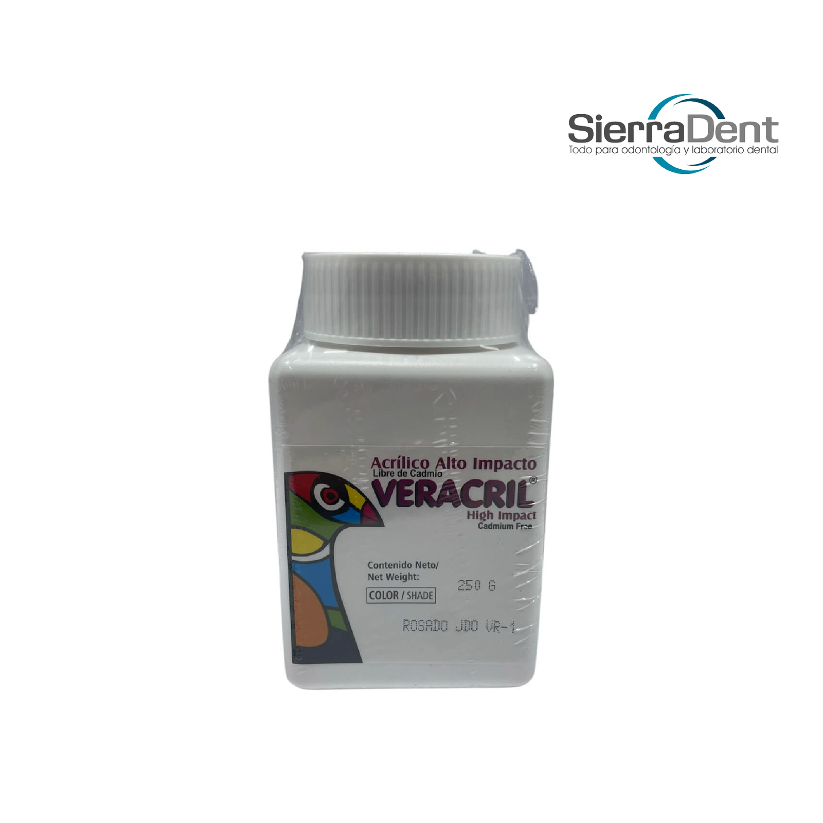 Acrílico termo curado de alto impacto VR-1, presentación de 250g. Alta resistencia mecánica, indicado para bases de prótesis completas o parciales.