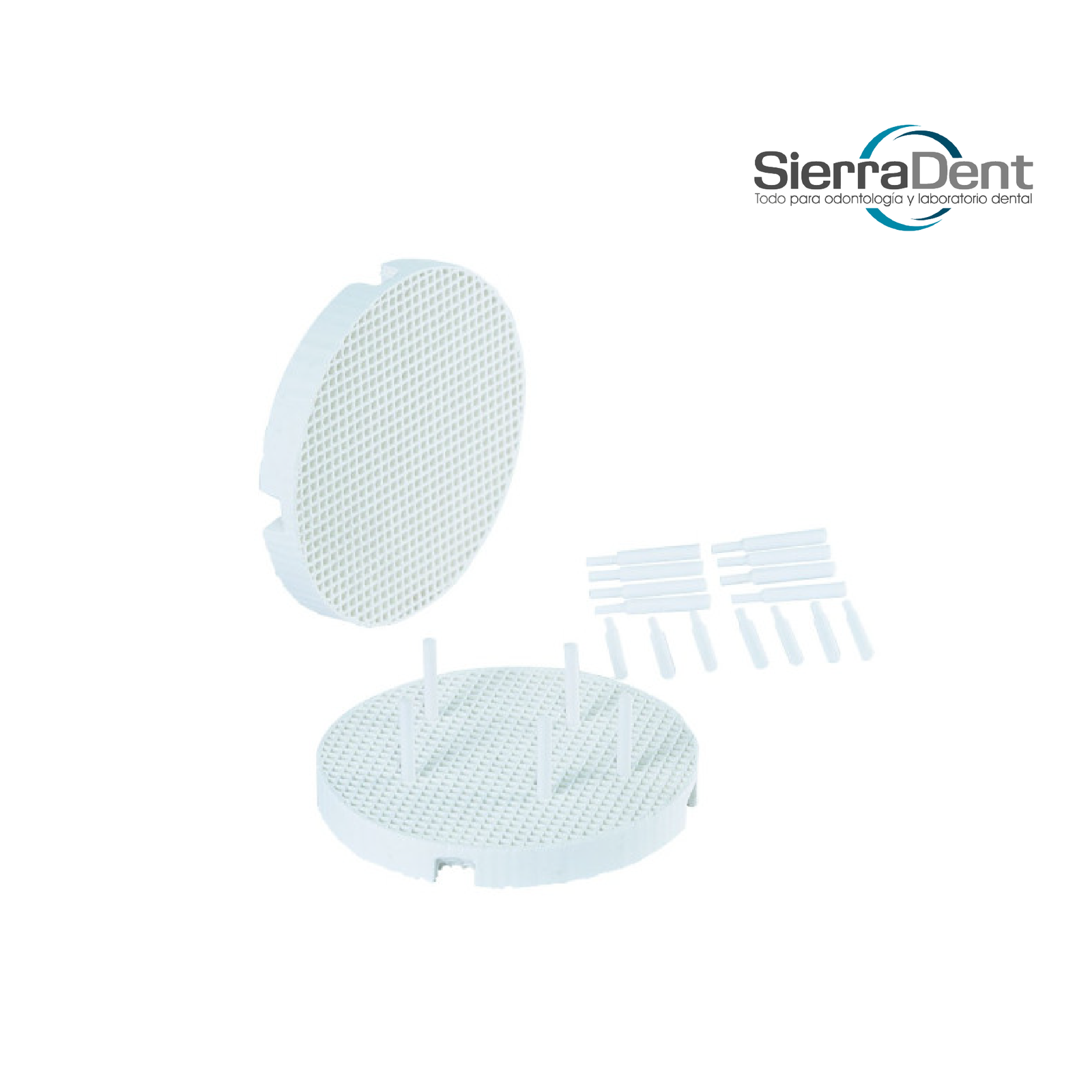 Bandeja de organización y soporte tipo panal, equipada con pines cerámicos ideales para fijar modelos dentales durante procedimientos de laboratorio. Los pines cerámicos ofrecen alta resistencia al calor, lo que los hace perfectos para trabajos con materiales que requieren cocción en horno. Su diseño permite una distribución precisa y segura de las piezas, optimizando el flujo de trabajo y la calidad del resultado final.