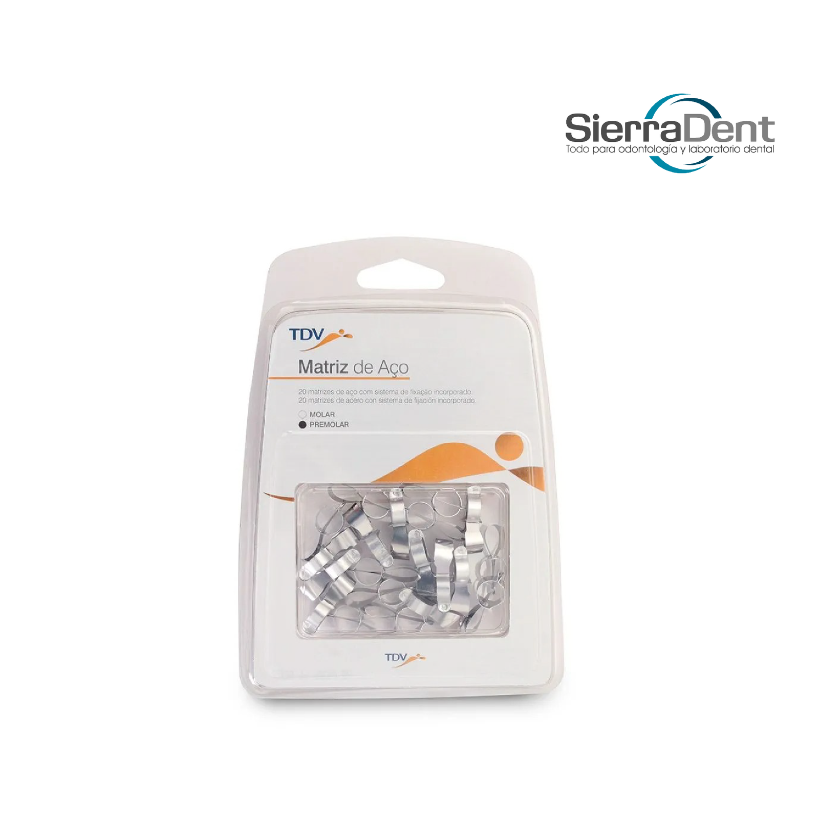 Matriz metálica anatómica preformada para molares. Asegura una correcta adaptación marginal en cavidades clase II, permitiendo un excelente punto de contacto y forma proximal.